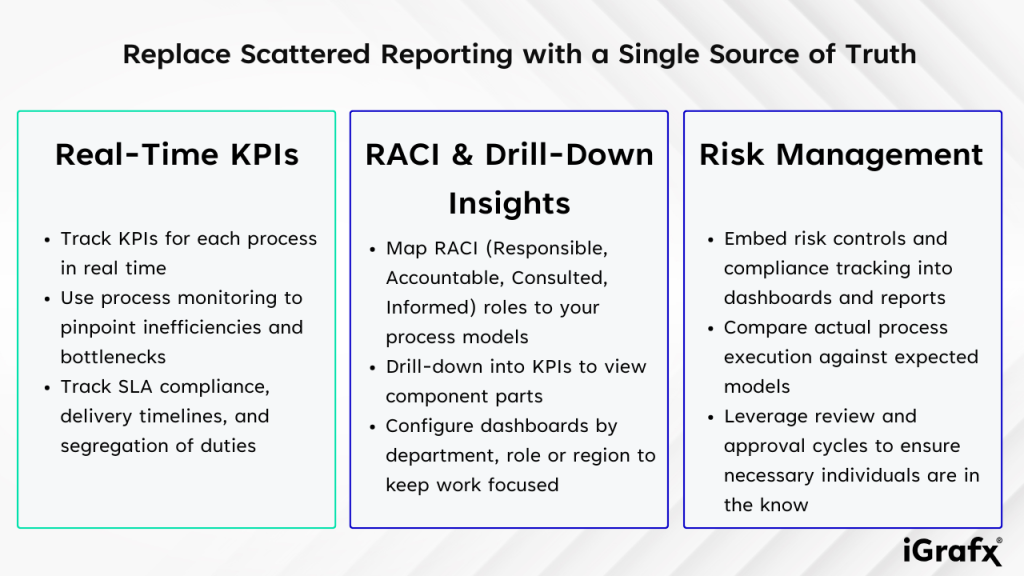 iGrafx Process360 Live changes that. By tying real-time dashboards directly to live process models and RACI roles, it delivers accurate KPIs, clear accountability, and audit-ready risk insights. Every team sees the same trusted data, customized to their role.