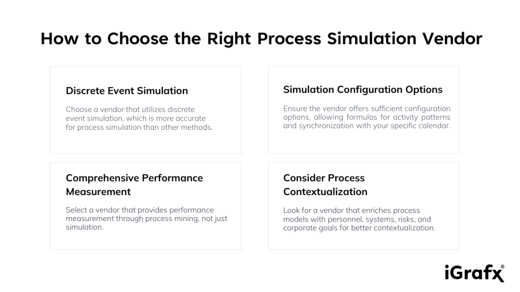 Specifically for process simulation and other types of simulations that involve time-series data, you’ll want to choose a simulation vendor that uses discrete event simulation. It is much more accurate than other simulation methods such as Monte Carlo for this purpose.